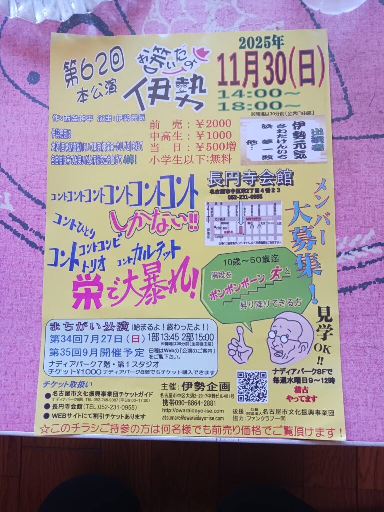 「お笑いだよ伊勢」の公式ホームページへようこそ! 私、伊勢元気座長は大阪(吉本新喜劇)に居て 東京(天突天 ・ ホリプロ)を経て 名古屋に来てお笑いだよ伊勢を 立ち上げ35 年!